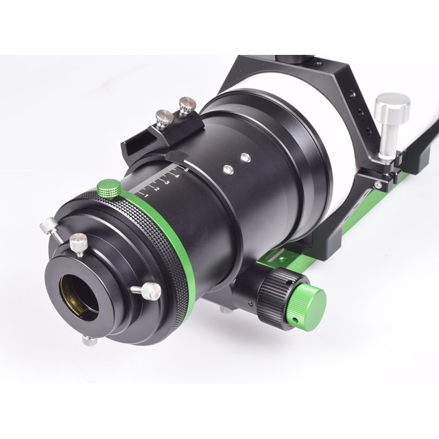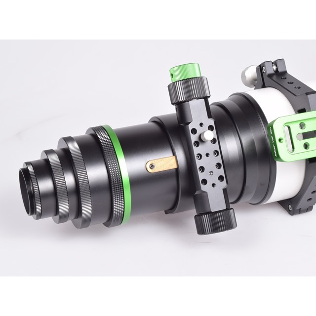 ●内蔵のフラットナーレンズにより、写真撮影や眼視観測において視野の端まで均一で崩れのない星像を楽しむことができます。フラットナーレンズは対物レンズに近い位置に組み込まれているため、綿密なバックフォーカス計算が不要で、カメラのフランジバックなどの制限を受けにくく、アクセサリー取り付けの自由度が高いのが特長です。