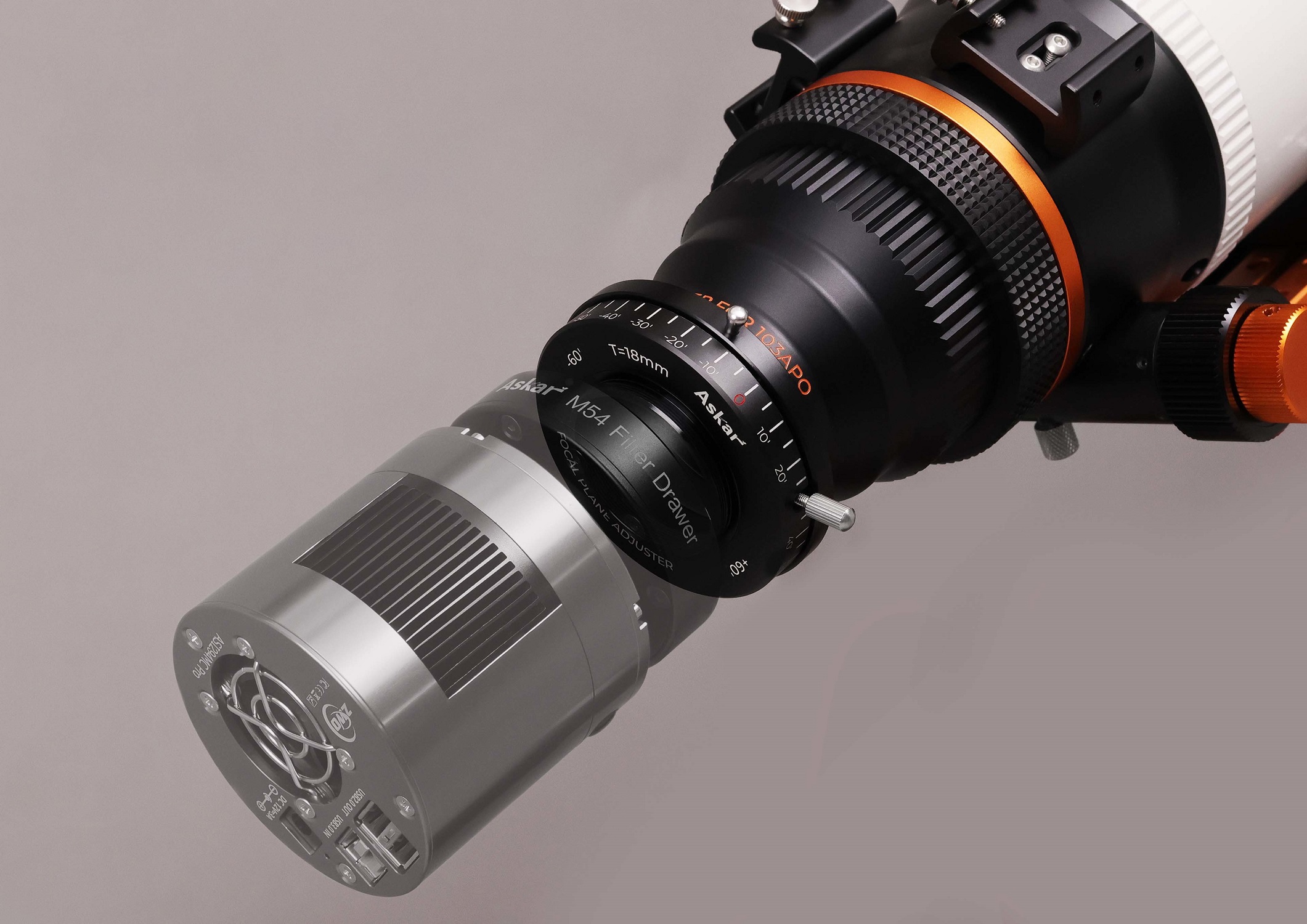 望遠鏡への取り付けはM54×0.75mm、光路長は18mmです。これは多くのAskar/SHARPSTAR製望遠鏡や補正レンズのM54→M48カメラ取り付けアダプターのサイズと同じ(APOシリーズ、V、71F、50EDPHなど)なので、追加の延長筒やバックフォーカスの調整が不要です。