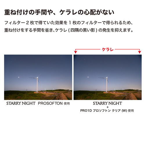 星景写真を撮る際に重ねて使用することが多い「スターリーナイト(光害カット)」と「プロソフトン(星座強調)」の効果を1枚のフィルターで得られます。重ね付けの手間やケラレを抑えるメリットがあります。ソフト効果は「PRO1D プロソフトン クリア(W)」相当。明るい星をにじませつつも、風景へのソフト効果を最小限に抑えているので、星景写真で風景はクリアに写したい時に最適です。