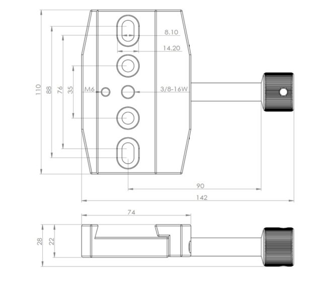 アリミゾの中心線には35mm間隔でM8ネジが通る素通しの穴が、さらに76〜88mmの間隔でM8ネジが通せる長穴が開いています。中央には3/8インチカメラネジ穴があいており、その脇に回転防止のためのM6ネジ穴(ホーロービス付き)が開いています。