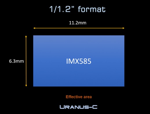 - Uranus-Cには、最新のSTARVIS 2テクノロジーを採用した裏面照射型のSONY製IMX585センサーが搭載されています。大型の1/1.2型フォーマットで一度に広い範囲を撮影するのに適しており、1ピクセル四方は2.9μm、約840万画素の高精細な画像が得られます。近赤外線にも高い感度を持っているため、様々なフィルターワークに対応し、天体撮影や電視観望の幅を広げることができます。電視観望や月、惑星撮影に特に適したセンサーです。