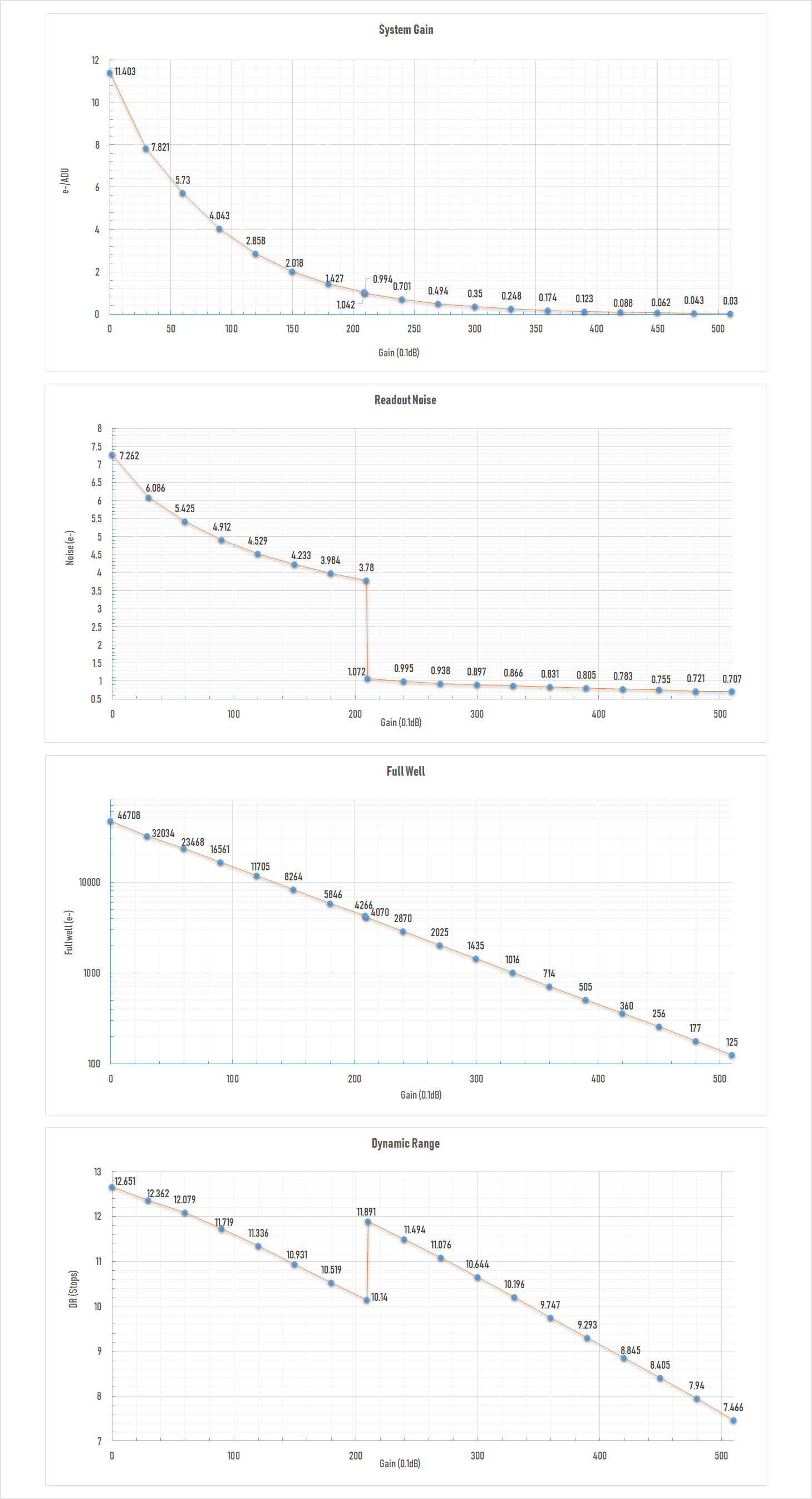 - Player Oneのプラネタリーカメラには独自のHCGモードが装備されています。HCGモードは、読み出しノイズを大幅に低減し、低ゲインと同じ高ダイナミックレンジを維持できます。カメラのゲイン設定が210以上になると自動的にオンになります。