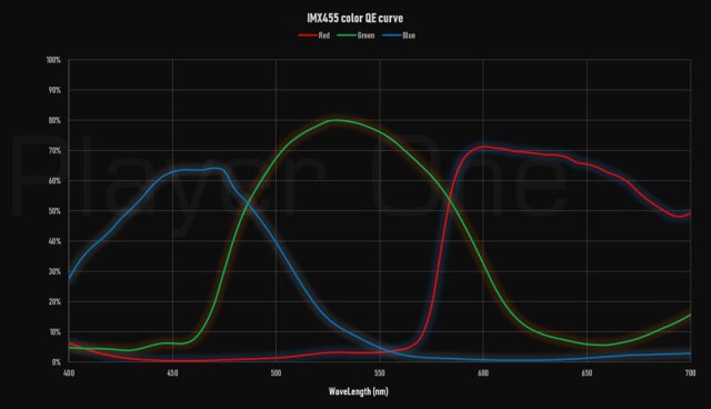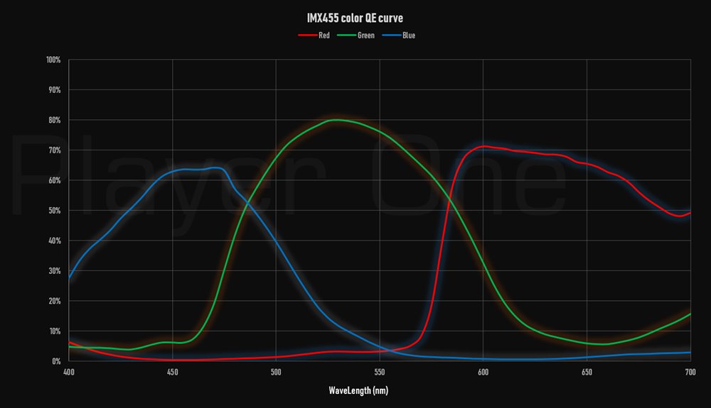 - Player Oneの独自のチューニングにより、IMX455のカタログスペックでは51ke-の飽和電荷容量(FullWell)を71.6ke-まで拡張しています。低gainの時は輝度差の大きな対象を撮影しても白飛びしにくく、表現の幅がより広がります