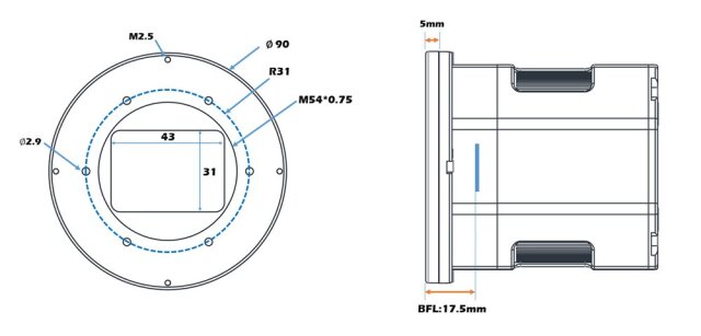 - また、望遠鏡との接続部分は円形になっており、一部のプライムフォーカス鏡筒に使用した際に回折光を円形に保ち、星像に与える遮蔽の影響を最小限にとどめる効果が期待できます。