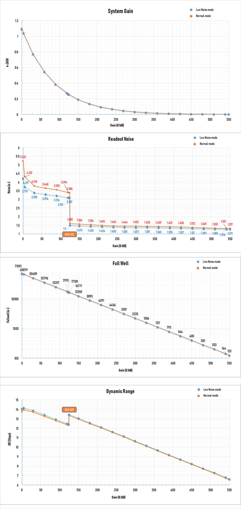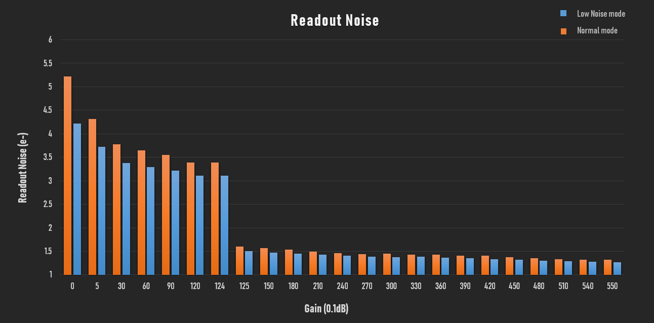 - ZEUSシリーズのカメラにはNormalモードとLowNoiseモードの2種類の異なる特性を持った画素読み出しモードが搭載されています。LowNoiseモードでは読み出しノイズが大幅に低減され、長時間露光時により低ノイズな画像を得ることができます。