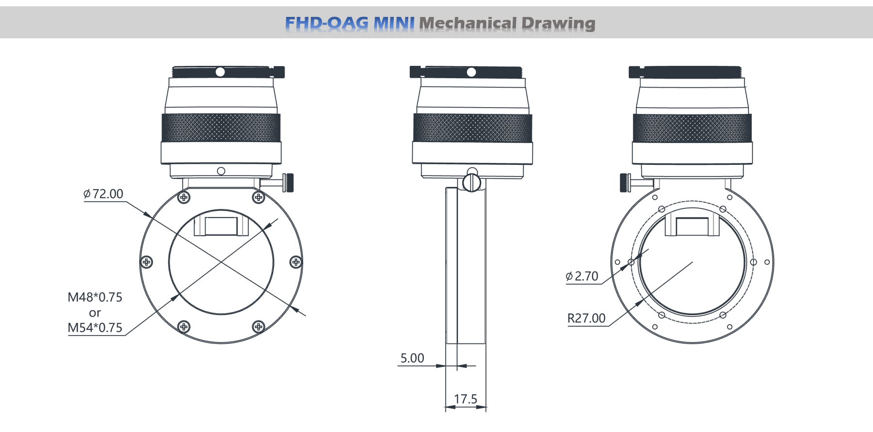 - 望遠鏡との接続はM48×P0.75もしくは別売のオフアキシスガイダーとM2.5ネジ×6本で行います。