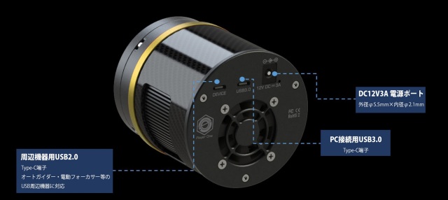 カメラとパソコンの接続には USB-A やUSB-B より先進的な規格である USB3.0 Type-C を使用します。USB Type-C にはコネクターの裏表の区別がなく、迅速で確実な接続が可能です。オートガイダーなどのアクセサリー用のポートも用意されており、接続には USB2.0 Type-C を使用します。