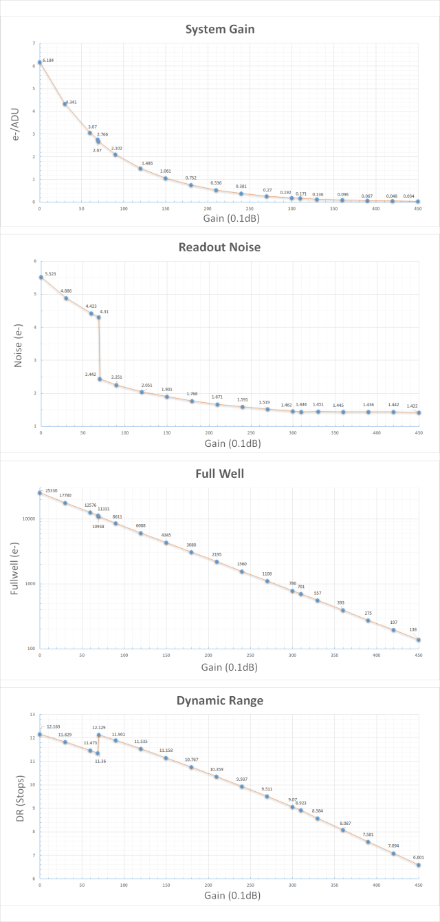 Bin1モードで最大飽和電荷容量(FW)が25.3ke-と広いダイナミックレンジを持ちながら最大51FPS、Bin2モードではFWが最大100ke-かつ最大135FPSのとなり、太陽等の電子観望等に適していますに適しています。