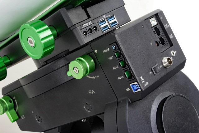 鏡筒を搭載するドブテイル部には4つのUSB3.0 ポート、3つの電源ポート、3つの出力AUXポートが配されており、カメラやオートガイダーなどを搭載する際に大変便利です。またマウント本体には3つの入力AUX ポートと、PC接続用USBタイプBポート、USB3.0タイプBポート、オートガイダーポートが各1つ配置されています。