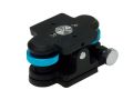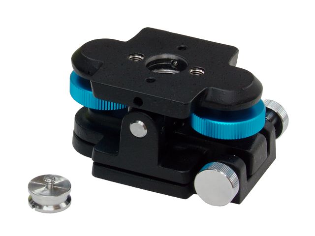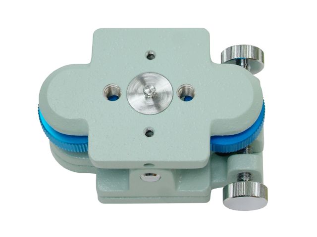 高い強度を活かしガイドマウントとしてもお使いいただける汎用性の高い微動装置です。微動部は固定力を重視して設計しました。上下微動は中央の軸を支点としたシーソー式で、ふたつの青いノブを回して上下に動かします。左右方向の微動はタカハシ製赤道儀に採用されている左右の押しネジで中央の金具を挟むタイプのものです。