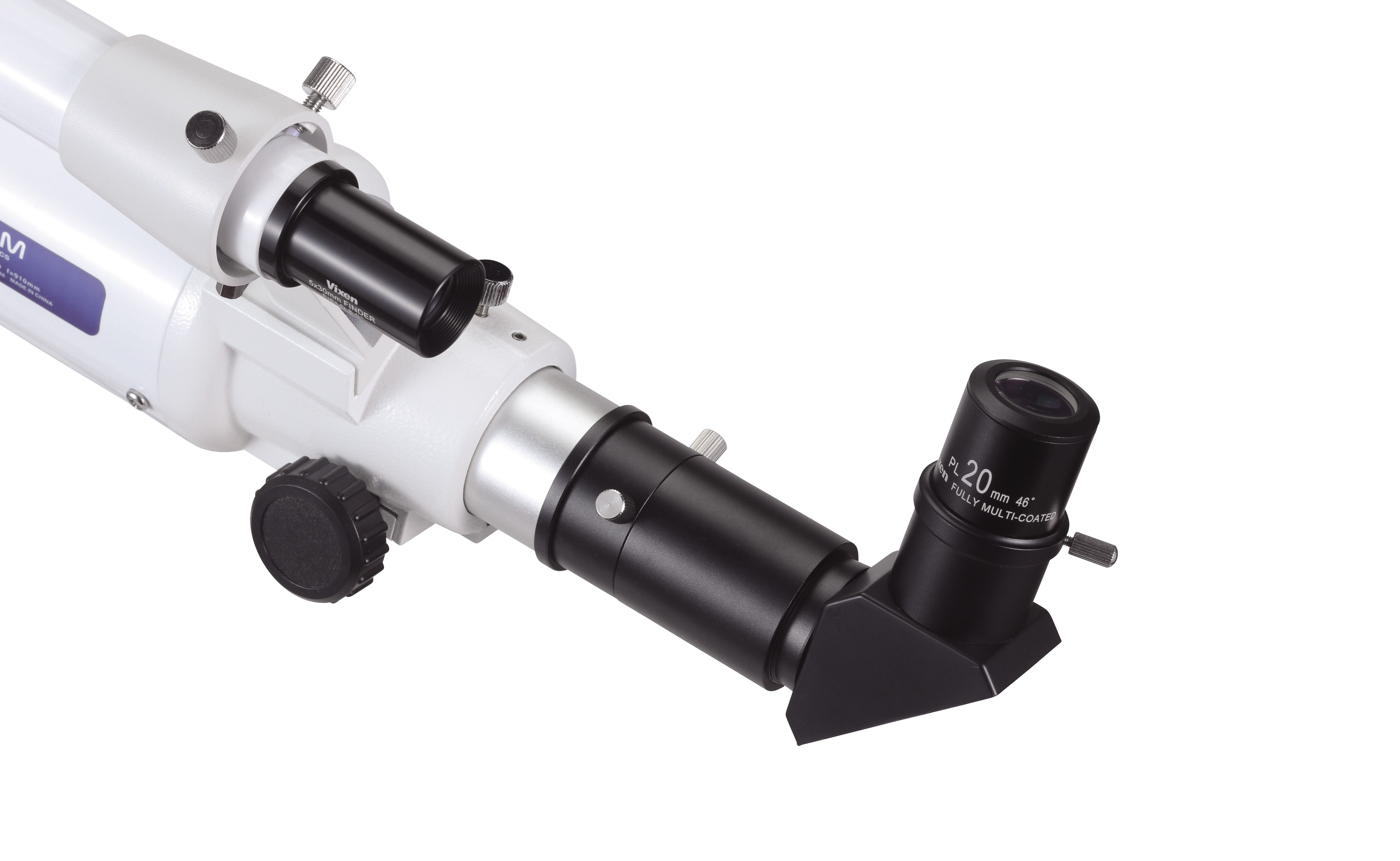 ピント機構は、丈夫な金属製ラックアンドピニオン式を採用。扱いやすい2種類の接眼レンズ(140倍、46倍)と、光路を90°曲げて楽な姿勢で観察できる正立天頂プリズムを付属しています。