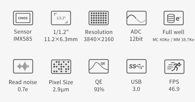裏面照射型の1/1.2インチサイズモノクロCMOSセンサーを搭載した非冷却カメラです。撮像素子は「Sony IMX585」を採用しています。解像度3,840×2,160、ピクセルサイズ2.9μmの撮像素子で、0.8eという極低読み出しノイズ性能と高い飽和電荷容量(38.7ke)を実現しています。ゼロ・アンプグロー回路や256MB DDR3バッファメモリも搭載しています。