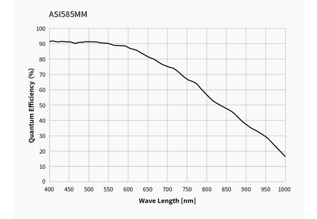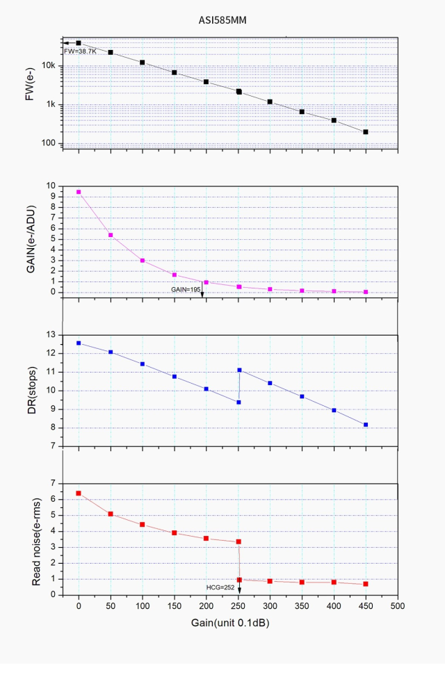 ASI585MMの「HCGモード」では、ゲイン値が200の場合、HCGモードは自動的にオンになります。その際、ダイナミックレンジを12ストップに近づけることができる一方で、読み取りノイズは1.5eと極めて低くなります。